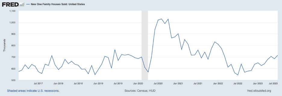 Also providing impetus has been residential construction and sales of new homes, shown in the chart below. The housing sector, which typically weakens more than other sectors in response to monetary restraint, took a dip once the Fed began to tighten policy in early 2022 but has been on an upswing in recent months, returning to pre-COVID levels.