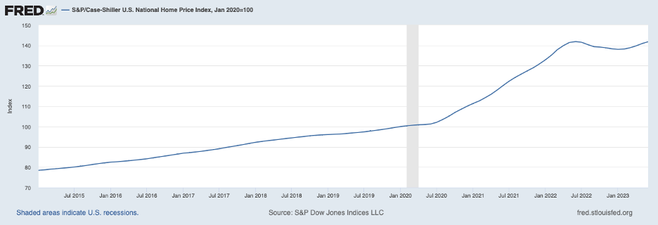 Firming housing demand can also be seen in home prices, shown next for existing homes. After soaring during the pandemic, home prices decreased once the Fed was in the early stages of tightening.