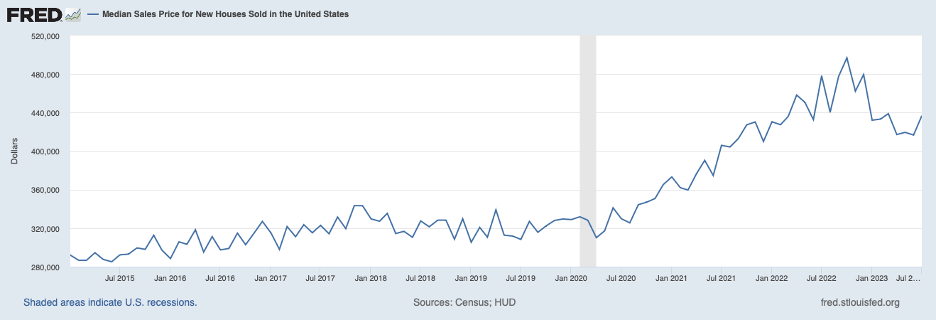 However, home prices have resumed increasing at a solid pace of late. A similar pattern is visible in the median price of new homes, shown below.