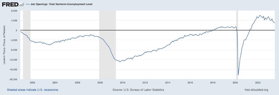 A second reason for caution about inflation being tamed is the ongoing imbalance in the labor market. The following chart shows the excess of job openings over the number of unemployed persons, which is still extraordinarily large through July (most recent data for job openings). While this excess has been shrinking, it remains rather large.