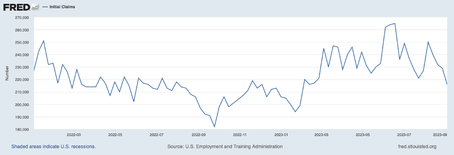 The tight labor market extended into early September based on weekly initial claims for unemployment insurance, shown in the following chart. Weekly claims have fallen in recent weeks to very low levels by historical standards.