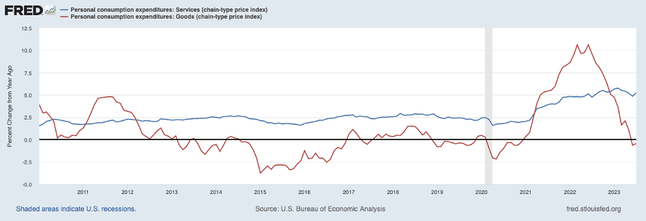 Goods prices (the red line) have fallen recently, reflecting an unwinding of supply chain disruptions, while service prices have continued to rise at roughly double the rate before the pandemic.