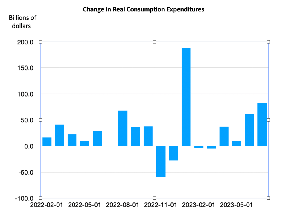 First, there appears to be a recent firming in aggregate demand, leading to growth in output exceeding the maximum sustainable rate of around 2 percent annually. A pickup in output growth in the third quarter is likely to bring growth over the first three quarters of this year up to 3 percent or higher. Pacing growth in output has been consumption, shown in the chart below. The increase in consumption spending in June and July, the last two bars, was among the strongest since early 2022.