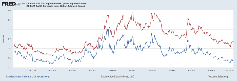 An implication of a perceived increase in default risk on Treasury debt is that Treasury yields would increase relative to those on high-grade other assets, such as top-quality corporate bonds. Shown next are yield spreads on AAA corporate bonds (blue line) and AA corporate bonds (red line). Both have narrowed about 10 basis points since mid-May, a relatively small amount but consistent with investors becoming more selective about Treasury debt.