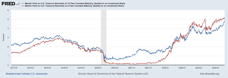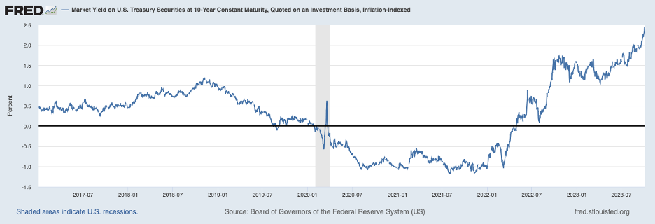 Below is the nominal yield on the ten-year Treasury note, the blue line. This yield has risen roughly 125 basis points (1.25 percentage points) since mid-May. The red line in the chart shows the yield on the two-year Treasury note, which has risen about 110 basis points over the same period. (Note: yields discussed in this report are through early October before the outbreak of war in Israel, which has led to a flight to safety and temporary declines in Treasury yields.)