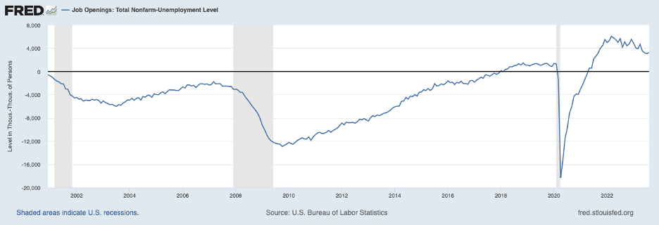But is the restraint sufficient to place inflation on a downward path to the Fed’s 2 percent target? There are some indications that the economy will need an even higher real interest rate. Excess demand in the labor market, proxied by the excess of job openings over the number of unemployed persons in the chart below, has narrowed only slightly over recent months and still has some ground to cover before a more typical relationship is restored in the labor market. Moreover, new claims for unemployment insurance (not shown) have continued to run at historically low levels, confirming that the labor market stayed hot into early October.
