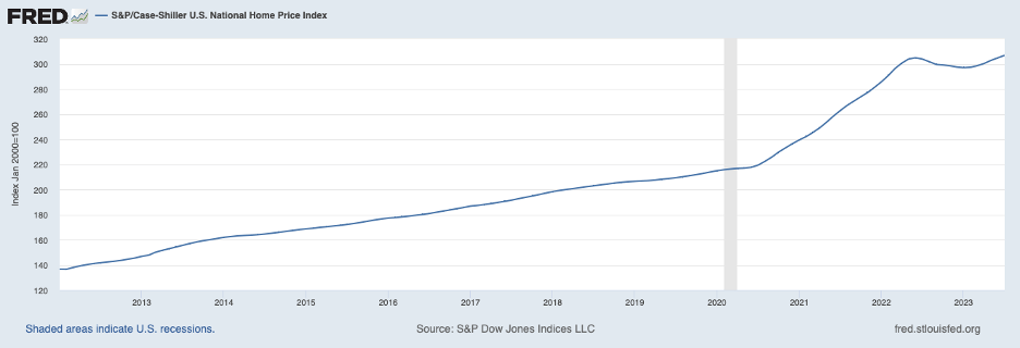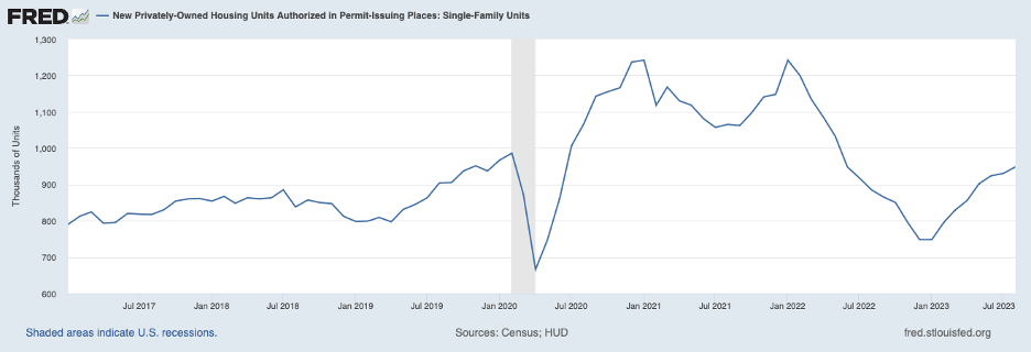 The housing market, which is one of the most responsive to interest rates, also hints that interest rates will need to rise further to sufficiently reign in aggregate demand to get to a path to price stability. The following chart shows that permits for single-family homes continued on the upswing through August (most recent data). The housing sector appeared to be weakening in response to the Fed’s tightening that began in early 2022 but has been on an upward march this year. Furthermore, prices for existing homes have also increased in 2023, as shown in the following chart.