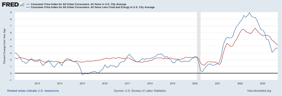 The most recent consumer price data also suggest that more monetary restraint may be needed. The following chart shows headline CPI inflation through September (the blue line) and core CPI inflation (the red line).