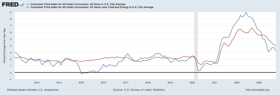 Meanwhile, inflation data have continued to be favorable through October. Next are the twelve-month percent changes in the headline CPI (the blue line) and the core CPI (the red line). Headline inflation dipped back to 3.3 percent in October, down from a peak of 8.9 percent in June 2022, while core inflation drifted down to 4.0 percent from a peak of 6.3 percent a year earlier in October 2022. Even better, the three-month core CPI inflation rate (from July to October) was only 3.4 percent, drawing closer to the Fed’s 2 percent target.