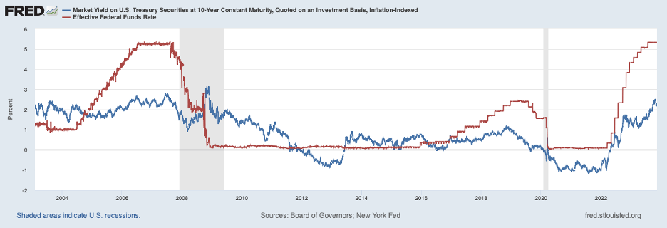 The Fed’s policy tightening can be seen by the red line in the chart below. Since mid-March 2022, the Fed has raised its nominal overnight federal funds target by 5.25 percentage points. Over that same time, the real yield on the ten-year Treasury note rose 3.1 percentage points from -0.8 to 2.3 percent. Three-fourths of that increase occurred over the six months or so immediately after the tightening began.