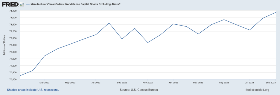 Business spending on capital goods has also been firming of late. The following chart shows new orders for capital goods (excluding defense orders and volatile aircraft orders). These orders leveled off after the Fed began tightening in March 2022 but have increased in the past few months.