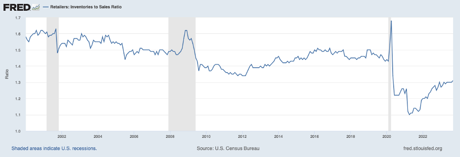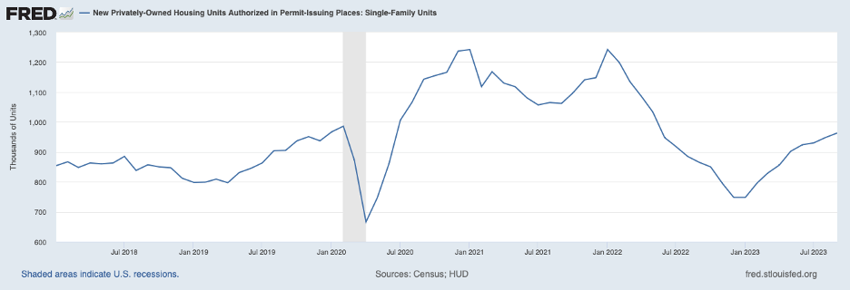 A similar story can be told about the housing sector. The following chart shows single-family housing permits, which declined over 2022, owing largely to the increase in interest rates. However, permits have been on an upswing in 2023, returning to pre-pandemic levels. Historically, The housing sector has been one of the sectors most impacted by tighter monetary policy but is displaying remarkable buoyancy.