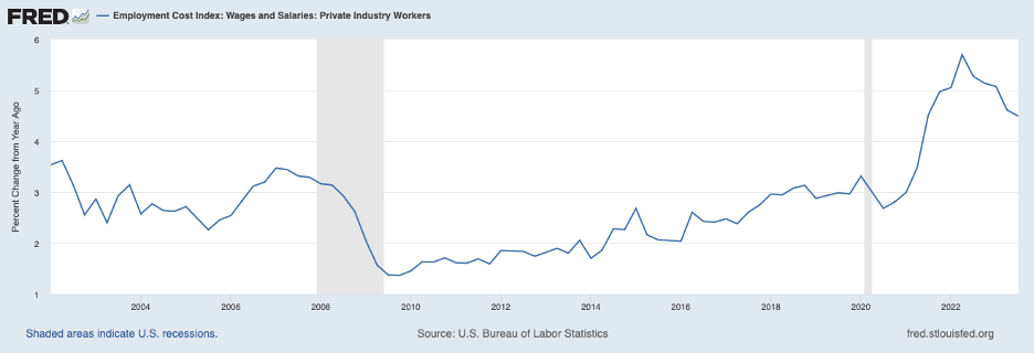 The following chart presents data through the third quarter on labor compensation based on the employment cost index (ECI, the most reliable measure of compensation). The four-quarter percent change has slowed but still has outpaced the pre-pandemic period by roughly 1-1/2 percentage points, suggesting that still-large increases in labor compensation are not compatible with the Fed’s 2 percent target for inflation. (Although compensation grew at a slower pace in the third quarter than over the year ending in the third quarter, the UAW settlement will be adding to compensation growth in the period ahead).