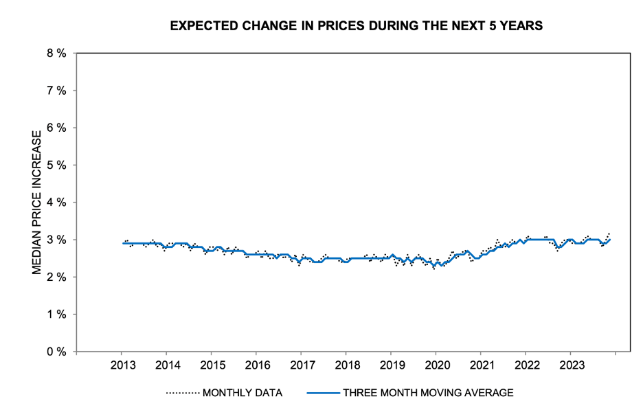 The next measure of inflation expectations, shown in the chart below, is for the five-year period starting in five years and is derived from Treasury securities market data. This measure has edged up over the past year but has been relatively stable over the past couple of years.