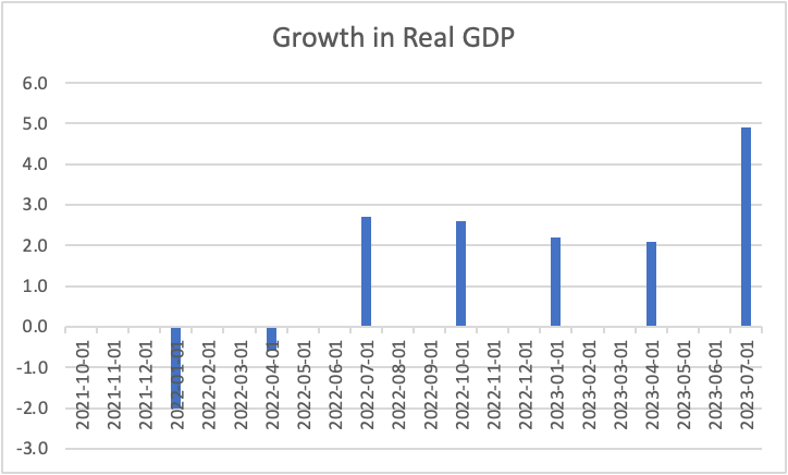 The pickup in growth of real GDP to nearly 5 percent in the third quarter, illustrated in the chart below, got a lot of attention. This growth was especially notable since many forecasters had come to expect a recession in the latter part of this year, largely brought on by the Fed’s policy tightening measures that began in March 2022. Moreover, the limited data available for the fourth quarter point to continued growth above the sustainable growth rate of output of nearly 2 percent per year.