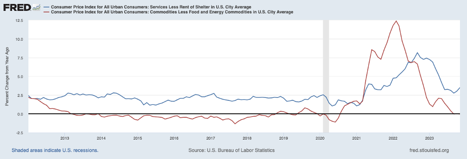 The following chart shows increases in CPI prices of services excluding shelter (the blue line) and commodities excluding food and energy (the red line). Service price inflation was 3.5 percent over the twelve months ending in November, a full percentage faster than before the pandemic, and picked up to 4.3 percent at an annual rate over the three months ending in November.