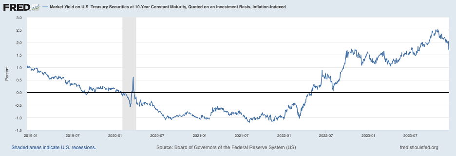 These findings suggest that Fed policy needs to remain restrictive to apply sufficient restraint on inflation to achieve the Fed’s 2% inflation target. The chart below shows the real interest rate taken from the market for ten-year Treasury Inflation-Indexed securities. This real rate — at around 1.7 percent — is much more restrictive than it was two years ago before the Fed began to tighten monetary policy. But the real rate is less than a percentage point above the neutral real rate — the interest rate that is neither expansionary nor contractionary. Moreover, the bulk of the increase in the real interest rate took place more than a year ago and is probably not holding down growth in output much at this point.