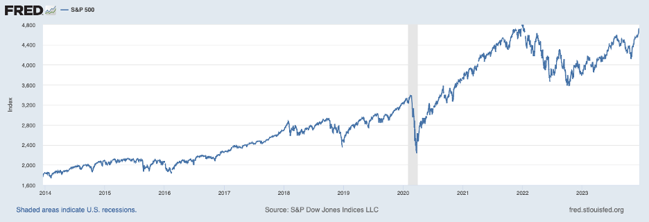 Indeed, recent labor market data — the labor market report for November and weekly initial claims for unemployment insurance through early December — along with retail sales for November suggest that underlying growth in output remains solid but at an unsustainable rate. No doubt the lofty stock market, shown below, with share prices approaching their record high, is helping to fuel this growth.