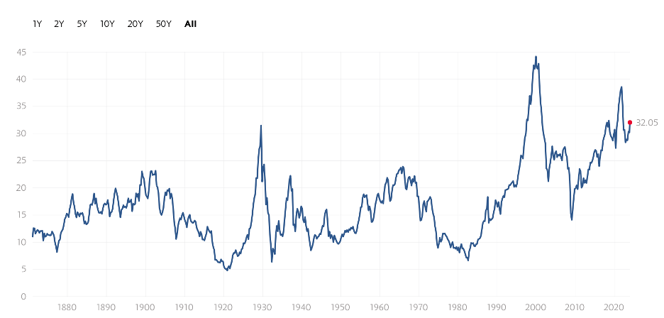 The following chart shows that share prices are also high in relation to (cyclically adjusted) earnings. With real interest rates somewhat high, the elevated cyclically adjusted price-earnings ratio suggests a vulnerability going forward. A correction in the stock market cannot be ruled out.