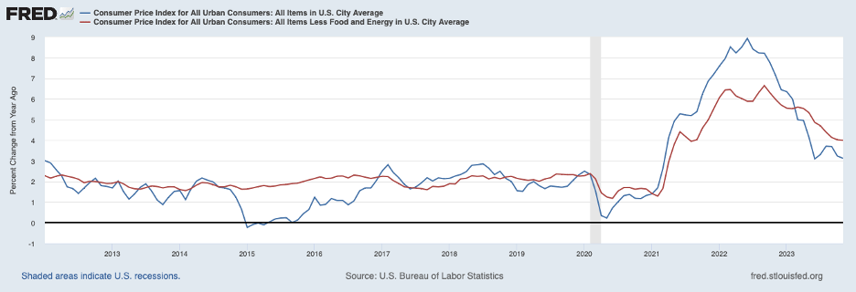 However, a careful reading of the consumer price index report (CPI) for November should give the Fed and market participants some pause. The twelve-month headline CPI increase was 3.1 percent — the blue line in the chart below — down 4 percentage points from a year earlier. The twelve-month change in the core CPI, which excludes food and energy prices — shown by the red line below — stayed at 4 percent. However, the annualized percent change in core inflation over the three months ending in November fell to 3.3 percent.