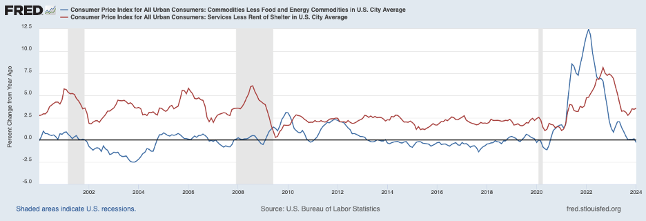 We can get a better picture of underlying inflation by breaking down core prices into prices of commodities (excluding food and energy) and services (excluding rent of shelter). Together, these two components of the CPI account for nearly half of consumer outlays. The services component excludes rent of shelter on the grounds that some have argued that the rent component may be overstating underlying rent increases based on other information that points to a slowdown in rent inflation. However, CPI data on the rent component has yet to show the slowdown that was anticipated.
