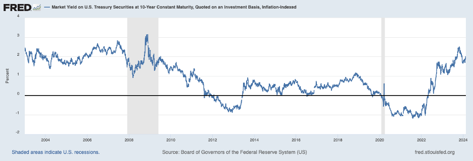Pulling the evidence together suggests that interest rates have not been high enough. Shown next is the real interest based on the ten-year Treasury inflation-adjusted note which is indicative of interest rates that drive business and consumer spending. This measure of the real rate of interest has risen some over recent days in response to disappointing inflation data but is only marginally above the level in the fall of 2022 when the Fed was in the midst of its tightening cycle. Furthermore, this rate is not particularly high by the standards of the past couple of decades, as the chart shows, and these earlier times of higher real interest rates were not times when the Fed was fighting such stubborn inflation as now. Moreover, the recent somewhat subdued level of the real interest rate is helping to buoy stock and home prices, fueling some of the strength in aggregate demand and output growth.