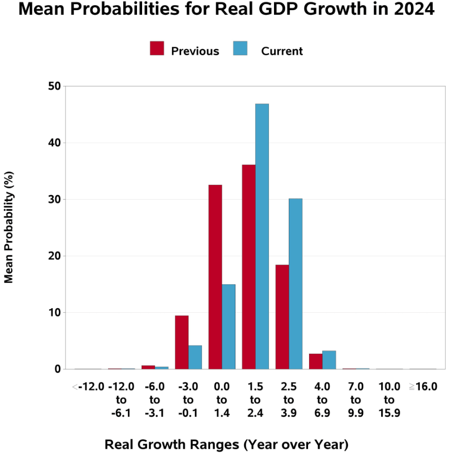 The above reading of recent inflation data is consistent with growth in output. A strengthening of growth in the second half of 2023 brought growth for the year up to 3.1 percent—a good bit above the sustainable rate of growth of nearly 2 percent. Moreover, available data for the first quarter of this year are pointing to growth in excess of 2.5 percent according to a closely followed model forecast prepared by the Federal Reserve Bank of Atlanta. (A lot of attention has been given to the drop in retail sales in January. However, retail sales around year-end need to be interpreted carefully because seasonal patterns have been shifting around year-end. In particular, the growing use of gift cards and certificates is changing actual spending patterns and methods of adjusting for seasonal variation have yet to catch up.) Indeed, professional forecasters are revising upward their forecasts for growth in 2024, as shown in the following chart. These forecasters now foresee growth in real GDP of 2.4 percent in 2024, up from their 1.7 percent forecast last November.