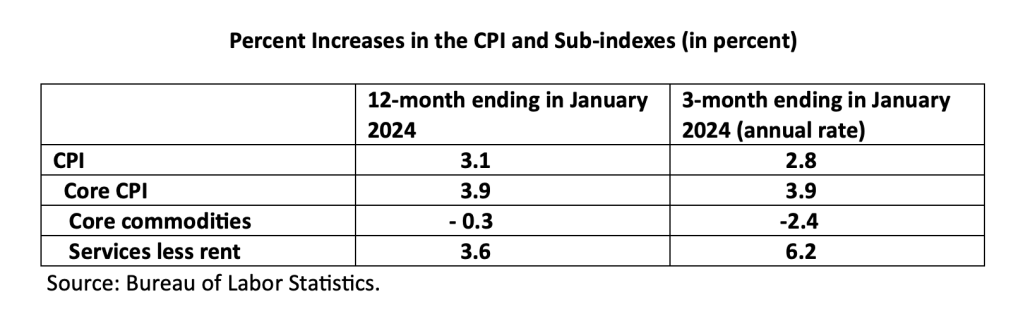 The chart below plots twelve-month headline inflation (blue line) and core inflation (red line). Headline CPI rose 3.1 percent in January, down from 6.4 percent a year earlier. Core CPI (which excludes volatile food and energy prices) rose 3.9 percent over those twelve months and has not shown much deceleration over recent months. Indeed, the core CPI rose at a 3.9 percent annual rate over the three months ending in December, as shown in the table (below the chart), suggesting no further deceleration in core prices.
