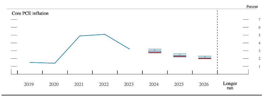 However, the view that interest rates need to be moving higher to bring down inflation is not the view of Fed policymakers. Below is Fed policymakers’ most recent forecast of core PCE inflation. The solid blue line shows the actual rate through 2023 and the red bars show the median forecast for 2024 and the following two years. As can be seen, the median forecast drifts down to the 2 percent target in 2026.