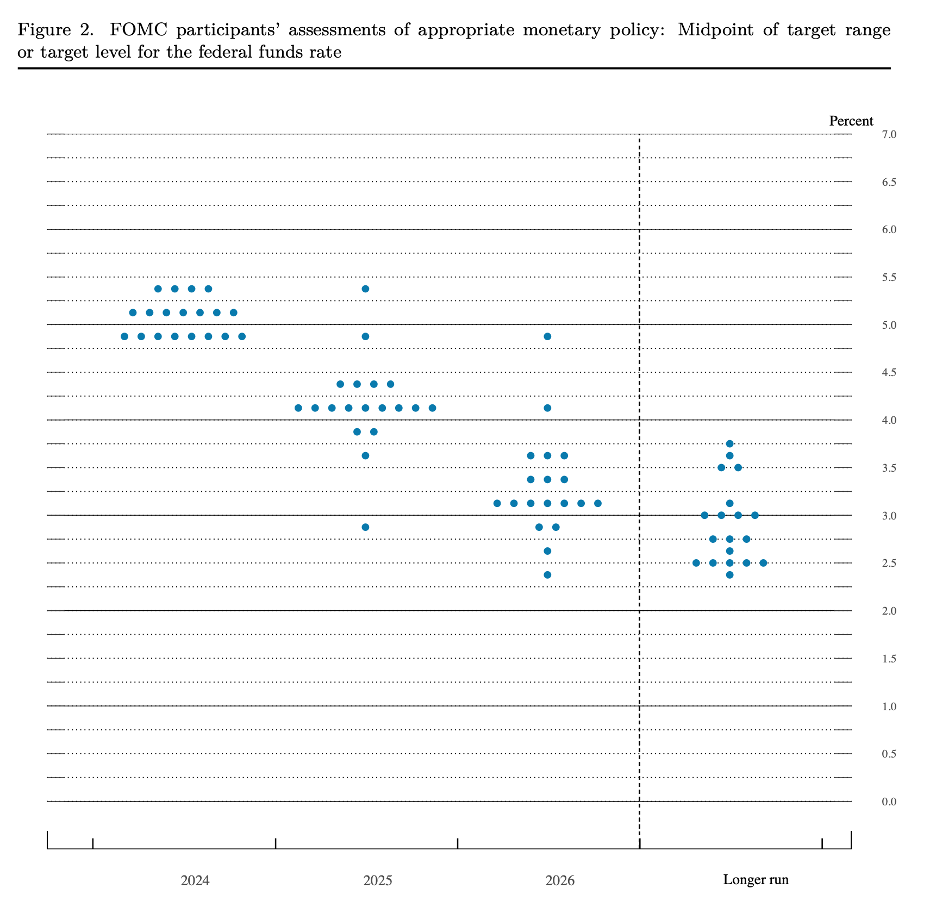 Moreover, this reaching of the inflation target is achieved without any increases in the target for the federal funds rate. Indeed, the following chart (“dot plot”) shows that the median Fed forecaster envisioned that the target for the federal funds rate will drop 25 basis points this year, 100 basis points in 2025, and another 100 basis points in 2026.