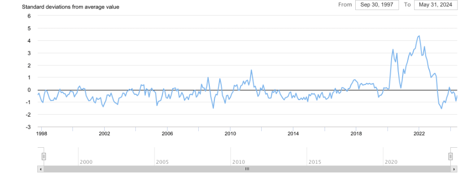 Consequently, core inflation surged as illustrated by the blue line below. Once supply chain bottlenecks were fixed, supply chain pressures began to unwind and prices of commodities retraced a portion of their previous increase. This retracing contributed to a considerable slowing in core inflation. More recently, supply chain pressures appear to be normalizing. With the normalization, the contribution of commodity price declines to disinflation is drawing to an end.