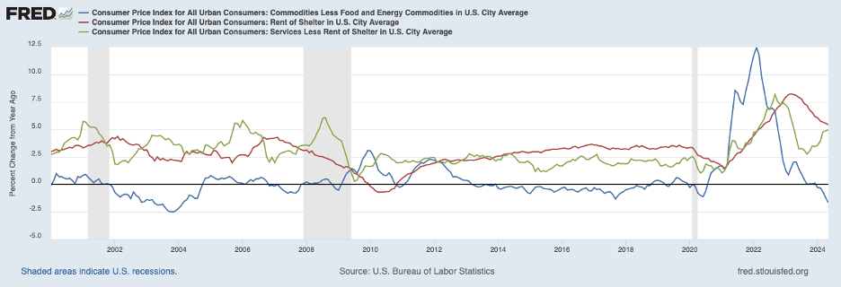 Another factor that has tended to distort the core CPI as a measure of underlying inflation is the rent of shelter. As shown by the red line in the chart above, this component of the core CPI surged from less than a 2 percent rate of increase in early 2021 to a peak of 8 percent in early 2023 and has fallen to a 5.5 percent rate most recently. Other information on newly negotiated rents suggests that rent increases have slowed more than what is being captured in the core CPI and thus may be working toward overstating the core measure of inflation.