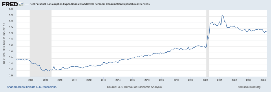 A consumer shift from services to commodities has added to the swings in commodity prices. At the onset of COVID, people started to shift away from services, such as restaurants and air travel, and toward tangible commodities. This can be seen in the following chart, which shows the ratio of commodities purchases to services purchases. This ratio spiked in 2020 and has unwound only a portion of that spike since then.