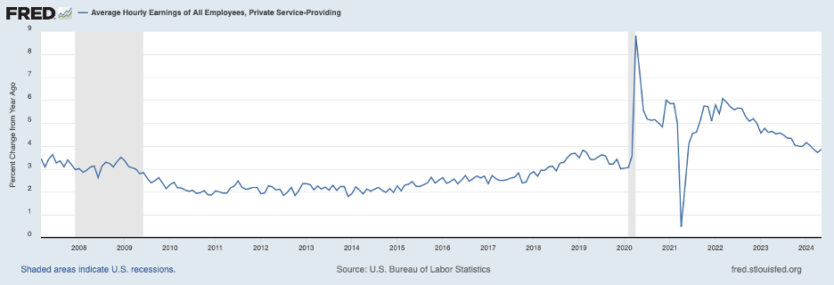 Labor cost pressures are another consideration in assessing underlying inflation, especially in the service sector. The following chart shows twelve-month increases in average hourly earnings in the private service sector. The chart and the table above indicate that this gauge of labor costs is leveling out at just under 4 percent at an annual rate, roughly one percentage above the rate over the decade before COVID.