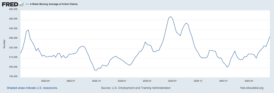 The labor market has been cooling a bit judging from initial claims for unemployment insurance, shown as a four-week average in the chart below.