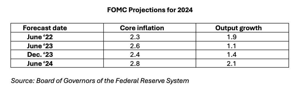 Fed policymakers may be correct, and a soft landing can be achieved without any further increases in the target for the federal funds rate. However, the Fed has regularly underpredicted inflation in recent years and needs to revise its projection upward for core PCE inflation. This is illustrated in the table below, which contains projections of core inflation and output growth for 2024 at different times in the past. Indeed, the median forecast for core PCE inflation has been revised upward by 0.4 percentage points since last December from 2.4 to 2.8 percent. To achieve this forecast, monthly increases in the core PCE index will need to slow to just under 0.2 percent over the remainder of the year from 0.27 percent for the period through May.