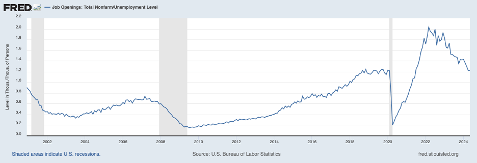 At the peak, there were two vacant positions for every unemployed person; now, there are 1-1/4, roughly the same ratio as before the COVID pandemic.