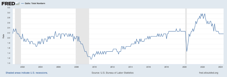 Still another labor market indicator is the rate of job quits, shown next. When the job market is strong, workers are more inclined to quit their current job, believing they will have little difficulty finding a new one. The quits rate in the chart below peaked around the same time as the ratio of job openings to the number of unemployed and has returned to the pre-COVID rate, which, like the job openings ratio, was high by historical standards.