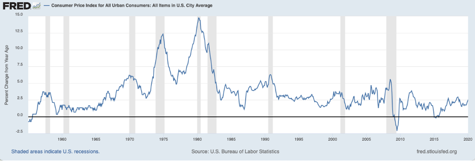 Historically, sustained reductions in inflation have been accompanied by or preceded by recessions, except for the 1960 recession. This pattern is shown in the chart below for CPI inflation. Recessions are shown by the shaded bars. Standard economic models relate inflation to slack in labor and product markets (as slack increases, inflation decreases) and to expectations of future inflation (as expectations of inflation increase, actual inflation increases).