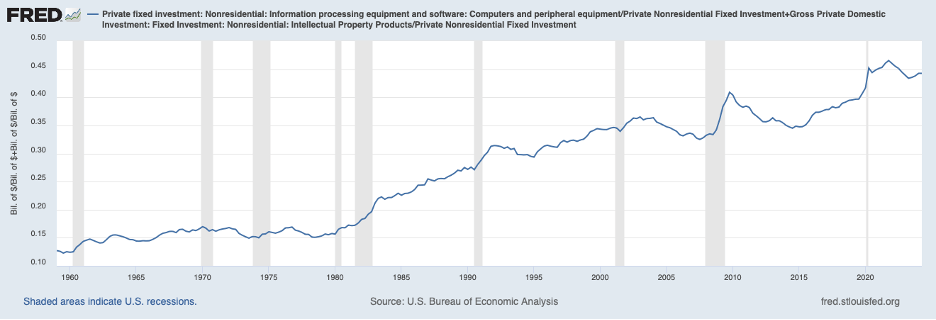 Moreover, the next chart shows that the share of total business investment going to R&D and IT has climbed to an all-time high this decade.