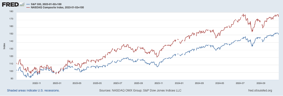 Moreover, an indicator of market sentiment toward tech stocks can be seen in the next chart, showing the behavior of the S&P 500 stock price index (the blue line) and the tech-laden Nasdaq over the past two years. The chart shows that the Nasdaq has considerably outperformed the S&P (which itself has a significant tech component) over this period.