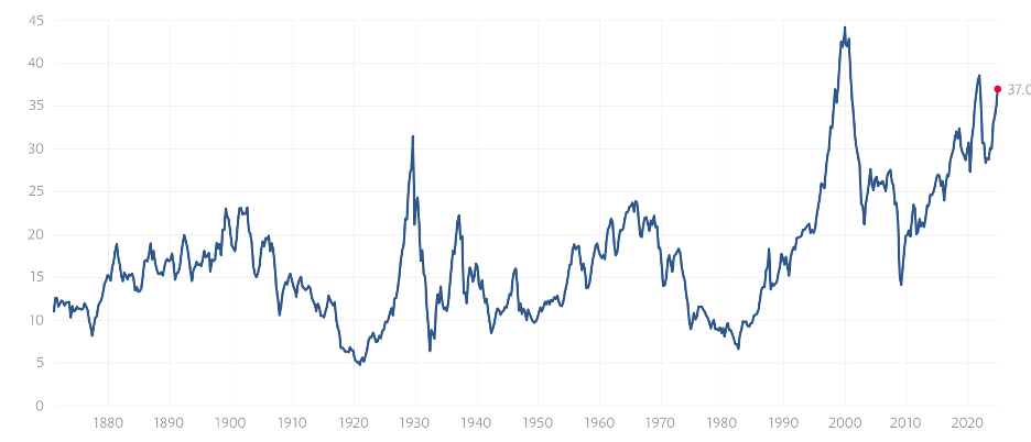 The equity market likely has gotten a lift recently from optimism about the outlook for corporate earnings coming from investments in AI. The next chart shows the Shiller cyclically adjusted price-earnings (P-E) ratio for the S&P 500. This ratio, at a share price of 37 times earnings, is well above the historical average of 17 and not much below the peak reached on the eve of the bursting of the dot.com bubble of the late 1990s. (To a degree, the current high P-E ratio reflects long-term interest rates on the low end of historical averages.)