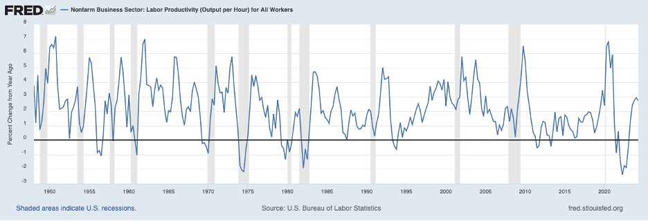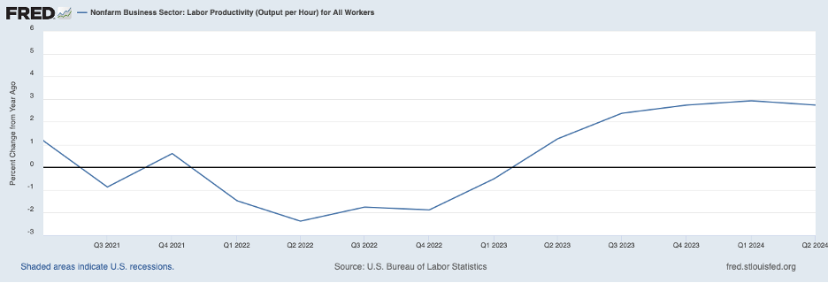 The most recent period is shown in the following chart, presenting productivity growth from the start of 2021 through the second quarter of 2024 (most recent data). Productivity declined slightly over 2021 and 2022 (productivity growth was negative) but turned up in early 2023. Productivity has been increasing at a robust 3 percent annual rate over recent quarters. Could we be on the cusp of another surge in productivity similar to that around the turn of the century, this time coming from AI?