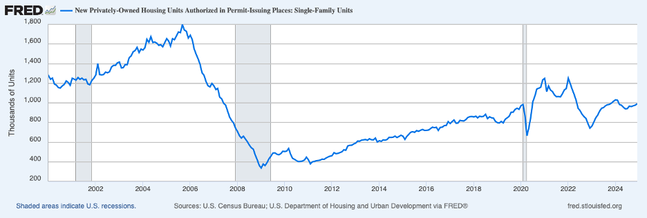The evidence since that time has been mounting that the U.S. economy ended 2024 on a strong note, raising questions about the degree of restraint coming from monetary policy. The momentum in growth of real GDP continued through the fourth quarter, which now appears to have stayed around a brisk 3 percent rate. One indicator of the resilience of the economy is the housing sector. Shown below are permits for single-family homes through the end of 2024. The chart shows that housing activity has been buoyant over recent months, running above the pre-pandemic rate, even though mortgage rates are nearly three percentage points higher than on the eve of the pandemic.