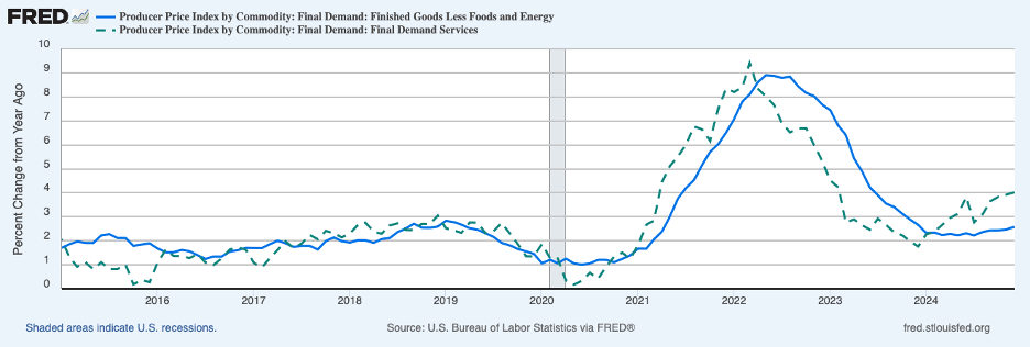 Despite downward pressure coming from the dollar, goods prices have been on the upswing over recent months. The blue line in the chart below shows twelve-month increases in the Producer Price Index for core goods (finished goods less food and energy). This measure has been edging up since mid-year and has been running above the pre-COVID pace in recent months. Moreover, the increase in PPI service prices has been on a general upward trend for the past year and also has been running above the pre-COVID pace. (A broadly similar story is found in the CPI data over recent months.)