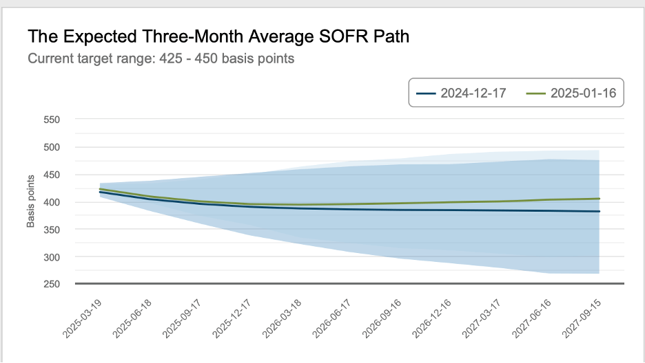 The chart shows that market participants now expect a shallower path of rate reductions in the period ahead than in mid-December which has contributed importantly to the recent backup in the ten-year benchmark rate. However, the higher benchmark rate is likely insufficient to curb the persistent inflationary pressures that the recent news examined above points toward. Coupled with prospective higher prices coming from tariffs and more fiscal stimulus, a reasonable conclusion is that the next move by the Fed will more likely need to be upward than downward.