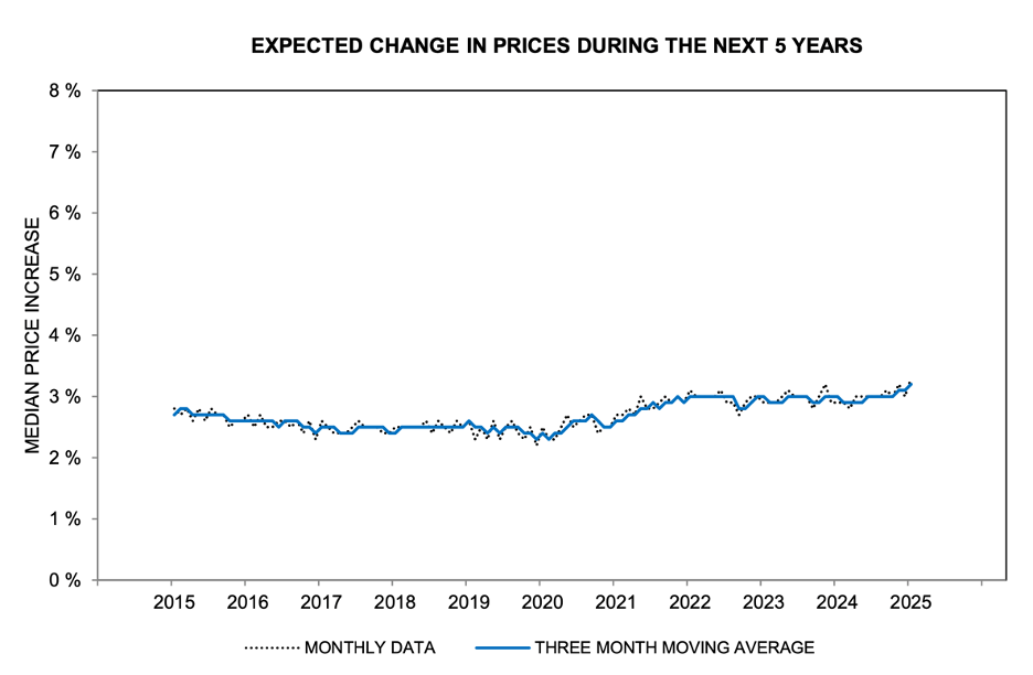 Inflation expectations may also be edging higher. Consumer expectations of inflation over the next five years from the Michigan survey are shown in the next chart. These expectations have been tilting upward over recent months, moving further away from the pre-COVID period, and perhaps are suggesting that consumers are seeing inflation to be more entrenched than previously.