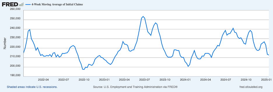 This ratio stopped declining in September 2024 and, since that time, has edged up. There continue to be more job openings than people who are unemployed, which likely persisted through December. Moreover, initial claims for unemployment insurance on a four-week average basis (which smooths out week-to-week volatility), the next chart, have been on an overall downward trajectory since mid-2024.