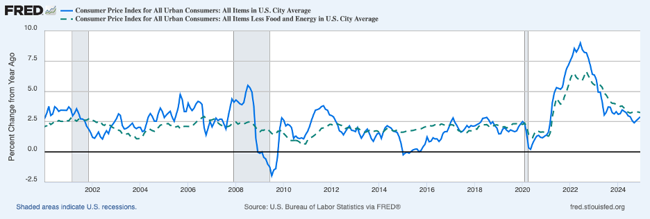 Turning to inflation, core CPI inflation ticked down to 3.2 percent on a twelve-month basis in December (shown by the broken green line in the chart below), even as an upturn in energy prices dragged headline inflation higher (the blue line). Core inflation over the twelve months ending in December 2024 was down from 3.9 percent over the comparable period in 2023.