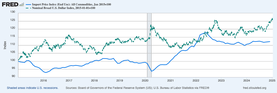 It is likely that recent strength in the dollar has been holding down consumer price inflation, especially goods price inflation. The chart below shows an index of the exchange value of the dollar (the broken green line) and an index of the level of import prices (the blue line). These two series typically move in opposite directions—when the dollar strengthens, import prices fall or level off. The exception was in 2021 and 2022, when supply chain disruptions led to a surge in import prices even as the dollar began to strengthen in mid-2021. Since late last September, the dollar has risen more than 7 percent, which likely has begun to and will continue to limit goods price inflation in coming months.